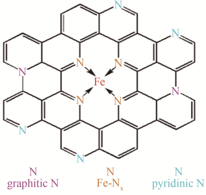 碳材料具有成本低、穩(wěn)定性好、比表面積大和導(dǎo)電率高等顯著優(yōu)點(diǎn),其作為催化劑載體或非貴金屬催化劑受到廣泛關(guān)注[4]。在氧氣的電化學(xué)催化中,氧氣可以在碳材料表面發(fā)生吸附和還原,但碳材料表面的氧還原反應(yīng)是以產(chǎn)生過氧化物的二電子途徑進(jìn)行,往往需要很高的過電位,不利于能量利用效率的提高。為了改善碳材料的氧還原性能,可以通過非金屬雜原子(N、S、P、B)摻雜或結(jié)構(gòu)調(diào)整來提高催化活性。Dai等首次發(fā)現(xiàn)非金屬碳材料是有效的ORR電催化劑,研究表明在碳納米管中摻雜氮改變了氧氣的化學(xué)吸附模式,促進(jìn)四電子反應(yīng)進(jìn)行,這可以有效地削弱或破壞氧氧鍵,顯著提高了ORR催化活性。摻雜在碳材料中的氮以吡啶型氮、吡咯型氮和石墨型氮的形式存在,通過改變氮源、調(diào)整溫度和合成方法可以得到不同比例的3種形式,但是目前對影響催化活性的氮的形式還沒有具體的定論。