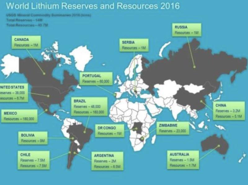 ■ 2016年全球主要國家鋰儲量、資源量分布圖