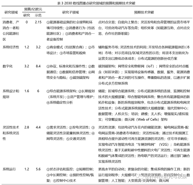為構(gòu)建2050愿景的五個(gè)基本要素,2030路線圖提出了綜合能源系統(tǒng)應(yīng)具備的12個(gè)功能(表2),基于6個(gè)研發(fā)重點(diǎn)領(lǐng)域?qū)嵤┭邪l(fā)和示范活動(dòng)以求到2030年實(shí)現(xiàn)這12個(gè)功能,其研發(fā)子領(lǐng)域、預(yù)算及預(yù)期技術(shù)突破如表3所示。
