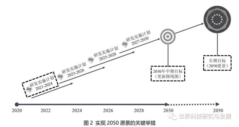 如圖2所示,歐盟計(jì)劃分4個(gè)階段實(shí)施2030路線圖,第一階段研發(fā)實(shí)施計(jì)劃于2020年5月發(fā)布,明確了研究創(chuàng)新優(yōu)先事項(xiàng)及相應(yīng)預(yù)算(共約9.55億歐元)。歐盟將陸續(xù)制定后續(xù)實(shí)施計(jì)劃,并在2030年更新研發(fā)路線圖以實(shí)現(xiàn)2050愿景目標(biāo)(圖3)。