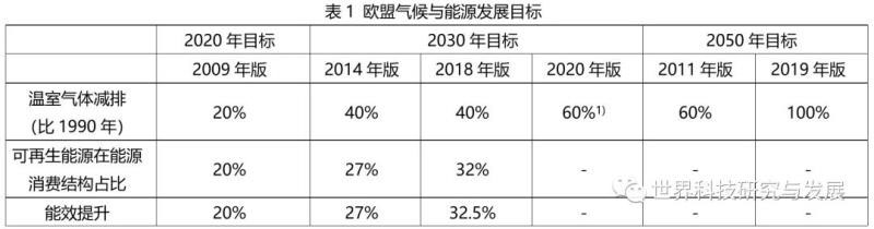 歐盟在能源綠色轉(zhuǎn)型方面的探索一直走在世界前列,將能源政策與氣候政策相整合,2010年起陸續(xù)發(fā)布了《能源2020戰(zhàn)略》、《能源2050路線圖》、《能源與氣候2030戰(zhàn)略》、《歐洲遠(yuǎn)期戰(zhàn)略愿景—給所有人一個(gè)清潔星球》和《歐洲綠色協(xié)議》等能源氣候戰(zhàn)略規(guī)劃,構(gòu)建起短、中、長(zhǎng)期可持續(xù)的前瞻性能源氣候戰(zhàn)略框架,提出了面向2020、2030和2050年的碳減排、可再生能源占比和能效的具體發(fā)展目標(biāo)(表1)。