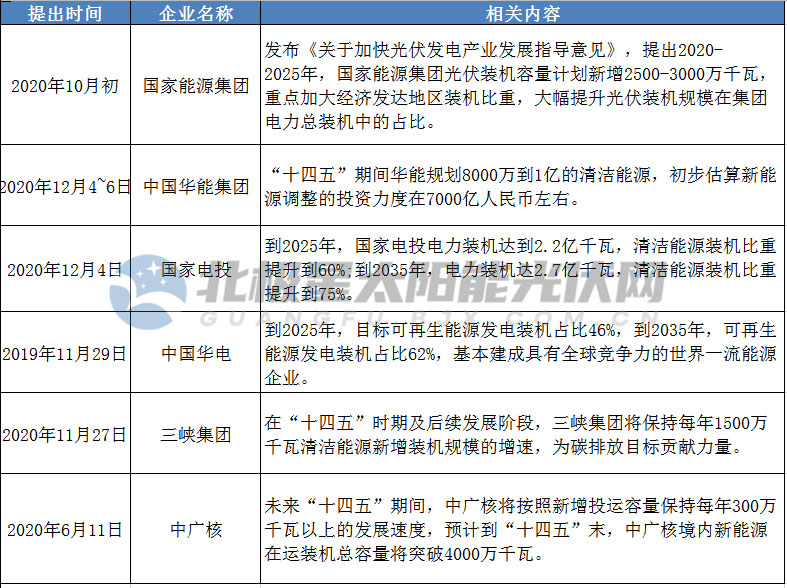 國家主席習(xí)近平12月12日在氣候雄心峰會(huì)上宣布到2030年,風(fēng)電、太陽能發(fā)電總裝機(jī)容量將達(dá)到12億千瓦以上。國家能源局新能源司副司長任育之不久前也曾預(yù)測,今年年底光伏發(fā)電從規(guī)模上將超過風(fēng)電,成為全國第三大電源,十四五新增光伏裝機(jī)規(guī)模需求還將遠(yuǎn)高于十三五。基于此光伏行業(yè)、企業(yè)對于“十四五”光伏產(chǎn)業(yè)表現(xiàn)出極大的信心并加緊制定新的企業(yè)發(fā)展規(guī)劃,“五大四小”發(fā)電集團(tuán)同樣如此。