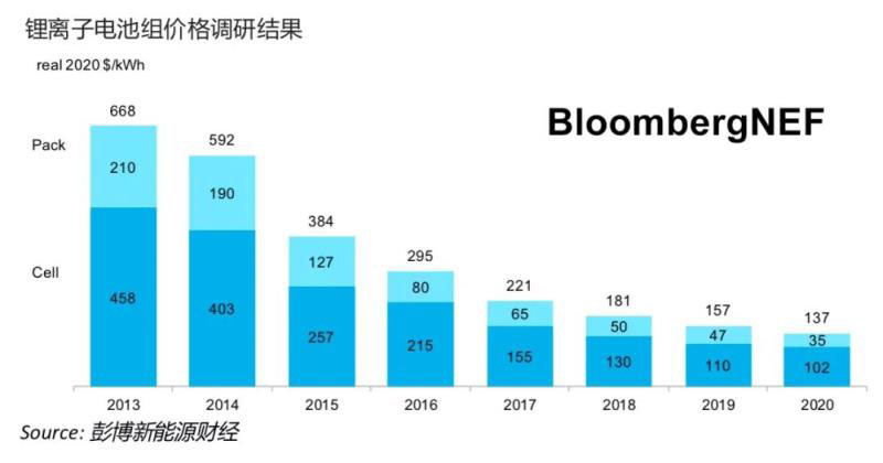 2010年到2020年間,全球鋰離子電池組平均價(jià)格從1100美元/千瓦時(shí)降至137美元/千瓦時(shí),降幅達(dá)89%。根據(jù)彭博新能源財(cái)經(jīng)的最新預(yù)測(cè),到2023年,鋰離子電池組平均價(jià)格將接近100美元/千瓦時(shí)。