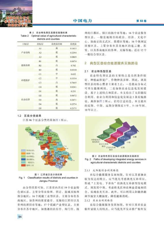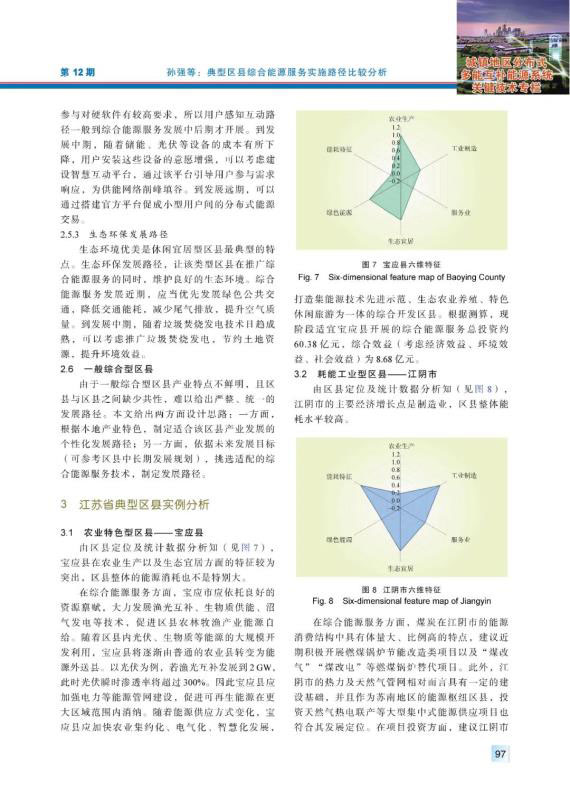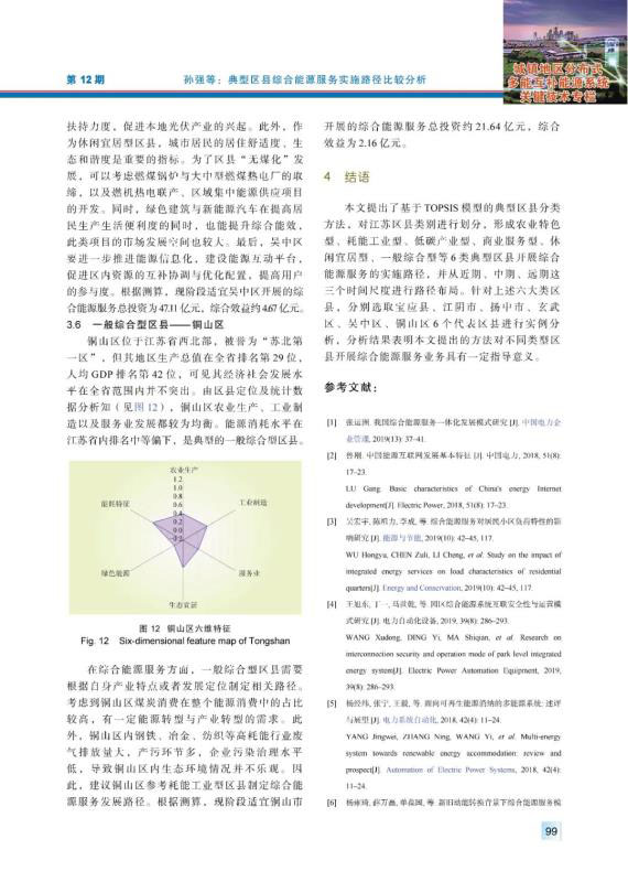 結(jié)論:本文提出了基于TOPSIS模型的典型區(qū)縣分類方法,對(duì)江蘇區(qū)縣類別進(jìn)行劃分,形成農(nóng)業(yè)特色型、耗能工業(yè)型、低碳產(chǎn)業(yè)型、商業(yè)服務(wù)型、休閑宜居型、一般綜合型等6類典型區(qū)縣開展綜合能源服務(wù)的實(shí)施路徑,并從近期、中期、遠(yuǎn)期這三個(gè)時(shí)間尺度進(jìn)行路徑布局。針對(duì)上述六大類區(qū)縣,分別選取寶應(yīng)縣、江陰市、揚(yáng)中市、玄武區(qū)、吳中區(qū)、銅山區(qū)6個(gè)代表區(qū)縣進(jìn)行實(shí)例分析,分析結(jié)果表明本文提出的方法對(duì)不同類型區(qū)縣開展綜合能源服務(wù)業(yè)務(wù)具有一定指導(dǎo)意義。