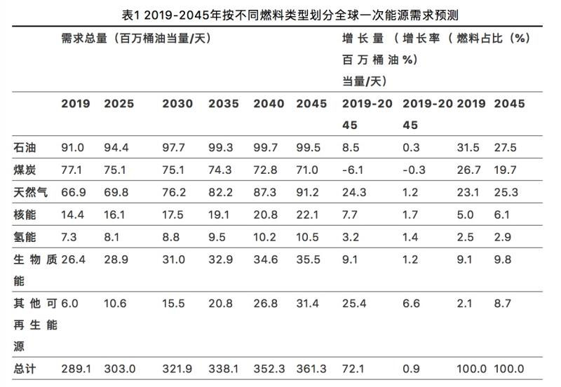 ?石油仍將在全球能源結(jié)構(gòu)中占據(jù)最大比例。如果新冠疫情在明年基本得到控制,全球石油需求預(yù)計(jì)在2021年部分恢復(fù),到2025年將達(dá)到9440萬桶/天,并在2045年達(dá)到9950萬桶/天。2019年,石油占全球能源需求的31%以上,預(yù)計(jì)到2045年將降至27%,但仍是最大的能源來源,其次是天然氣(約25%)和煤炭(近20%),如表1所示。