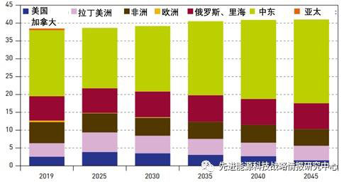 圖1 2019-2045年全球不同地區(qū)原油出口情況(單位:百萬桶/天)