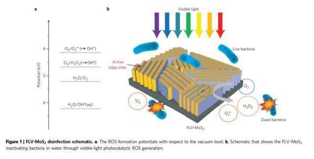 二硫化鉬是在電產(chǎn)氫產(chǎn)氧過程中發(fā)現(xiàn)的一個(gè)非貴金屬高效催化劑,劉翀洞察到如果將二硫化鉬與水反應(yīng),能夠有效的吸收光轉(zhuǎn)化成電子電洞即會(huì)產(chǎn)生自由基,自由基具有強(qiáng)氧化性,可以與水里細(xì)菌的細(xì)胞膜和細(xì)胞器發(fā)生反應(yīng),進(jìn)而殺掉細(xì)菌,達(dá)到滅菌效果。