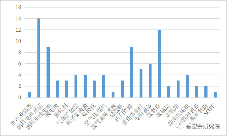 其中排在前三位的分別是燃料電池系統(tǒng)(14家)、氫制備(12家)、燃料電池電堆(9家)、閥門管路(9家),這與當(dāng)前國內(nèi)氫能和燃料電池汽車產(chǎn)業(yè)發(fā)展現(xiàn)狀比較契合。