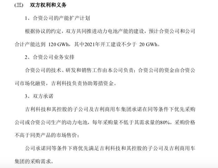 2018年12月,浙江吉潤與寧德時(shí)代簽署合資經(jīng)營合同,雙方共同出資設(shè)立合資公司。該合資公司注冊資本為10億元,浙江吉潤出資金額為4.9億元,出資比例為49%。不過,浙江吉潤與寧德時(shí)代的協(xié)議,僅僅說了會(huì)一起生產(chǎn)電池。