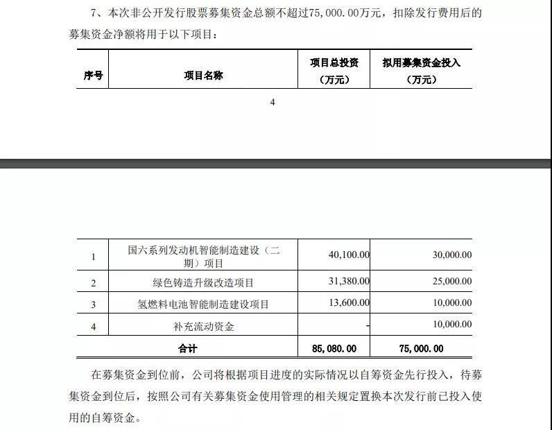 中國儲能網(wǎng)訊:近日,全柴動力發(fā)布公告,正式對外披露發(fā)公開發(fā)行股票預案。公司擬向控股股東安徽全柴集團有限公司在內(nèi)的不超過35名特定對象定增1.11億股,募資資金總額不超過7.5億元,投向國六系列發(fā)動機智能制造建設(shè) (二期)項目、綠色鑄造升級改造項目、氫燃料電池智能制造建設(shè)項目,及補充流動資金。上述項目總投資額8.51億元,擬使用募投資金7.5億元。