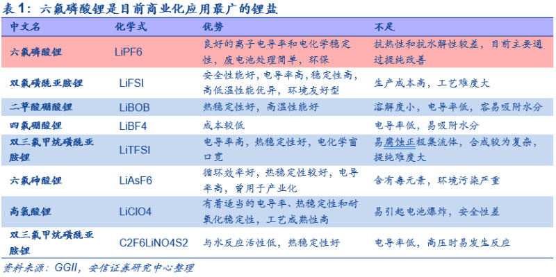 六氟磷酸鋰是電解液的重要組成部分,短中期內(nèi)可替代性低。電解液由高純?nèi)苜|(zhì)、溶劑和高純添加劑按照一定的比例配制而成,其核心競(jìng)爭(zhēng)力在于工藝控制和配方。由于六氟磷酸鋰在導(dǎo)電率、穩(wěn)定性和環(huán)保上的優(yōu)勢(shì),能夠顯著影響電解液的離子電導(dǎo)率、電化學(xué)穩(wěn)定窗口、高低溫穩(wěn)定性和氧化穩(wěn)定性等重要性能,因此目前被作為商業(yè)化應(yīng)用最廣的鋰鹽,在短中期內(nèi)可替代性較低,傳統(tǒng)鋰鹽高氯酸鋰、六氟砷酸鋰等,均存在難以克服的性能缺陷,難以實(shí)現(xiàn)大規(guī)模商業(yè)化應(yīng)用。新型鋰鹽中雙氟磺酰亞胺鋰電導(dǎo)率、穩(wěn)定性、高低溫性能等均較為理想,是最具商業(yè)化應(yīng)用前景的鋰鹽,但是其加工難度較大,成本和價(jià)格較高,對(duì)電解液及鋰電池成本影響較大,尚難以實(shí)現(xiàn)大規(guī)模量產(chǎn)和應(yīng)用,目前主要作為添加劑少量使用。