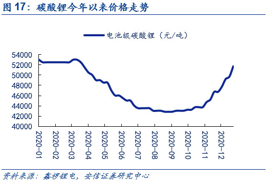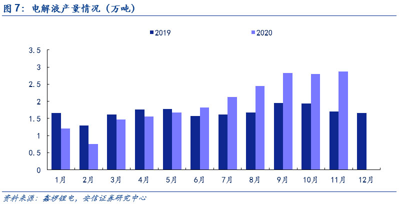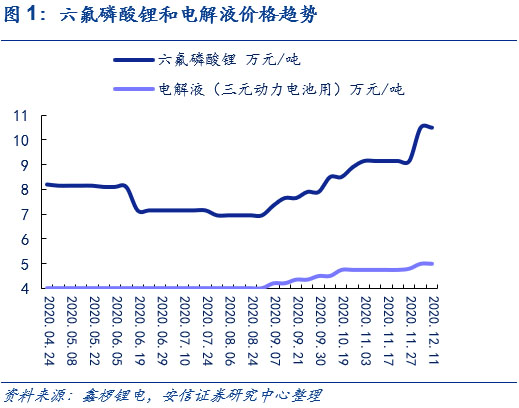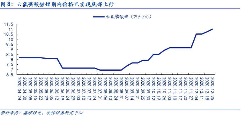 六氟磷酸鋰短期內(nèi)價(jià)格已底部上行。在下半年新能源車需求端顯著回暖和電解液的需求大幅度增長(zhǎng)的情況下,帶動(dòng)了六氟磷酸鋰需求增長(zhǎng),疊加原材料碳酸鋰價(jià)格上探,推動(dòng)六氟磷酸鋰企業(yè)議價(jià)權(quán)增加。在此基礎(chǔ)上,六氟磷酸鋰短期價(jià)格已實(shí)現(xiàn)底部上行。根據(jù)鑫欏鋰電,目前圣誕節(jié)前后六氟磷酸鋰的市場(chǎng)價(jià)格已經(jīng)增長(zhǎng)到了11萬元/噸。