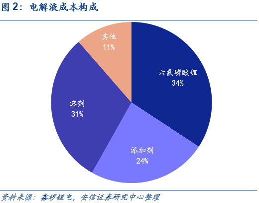 六氟磷酸鋰在電解液成本中占比較高,價(jià)格變動(dòng)影響電解液價(jià)格走勢(shì)。電解液原材料成本占據(jù)較大比重,其中原材料主要由溶劑、添加劑和鋰鹽構(gòu)成,鋰鹽目前以六氟磷酸鋰為主。從電解液的成本來看,根據(jù)鑫欏鋰電近期的價(jià)格統(tǒng)計(jì),結(jié)合電解液的材料用量測(cè)算,以最新的價(jià)格來看,六氟磷酸鋰目前在電解液的成本構(gòu)成中超30%;由于成本占比較高,六氟磷酸鋰的價(jià)格變動(dòng)也顯著影響電解液的價(jià)格走勢(shì)。