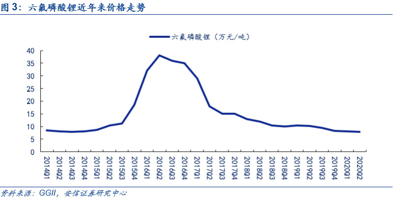 回顧過往,六氟磷酸鋰價(jià)格周期性明顯,2020年上半年仍處在價(jià)格底部。自2011年六氟磷酸鋰實(shí)現(xiàn)國(guó)產(chǎn)化后,由于第一輪擴(kuò)產(chǎn),疊加需求尚未大規(guī)模啟動(dòng),導(dǎo)致供過于求,價(jià)格長(zhǎng)期低于10萬元/噸;2015年以來新能源車的發(fā)展帶動(dòng)六氟磷酸鋰需求大增,短期內(nèi)新增產(chǎn)能無法彌補(bǔ)高速增長(zhǎng)的需求,根據(jù)GGII數(shù)據(jù),價(jià)格由2015年第三季度的10萬元/噸上漲至2016年二季度的38萬元/噸,漲幅高達(dá)280%;但在此后,由于需求端漲幅縮窄,疊加供給端新產(chǎn)能投放,到2017年第四季度,六氟磷酸鋰價(jià)格快速下滑,跌至15萬元/噸;進(jìn)入2018年后,價(jià)格下滑速度放緩,進(jìn)入9.5-11萬元/噸的區(qū)間;由于2019年新能源汽車銷量和2018年持平,六氟磷酸鋰的需求沒有增長(zhǎng),而此前新投產(chǎn)產(chǎn)能過多,行業(yè)仍然供大于求,疊加主要原材料碳酸鋰價(jià)格持續(xù)下跌,六氟磷酸鋰價(jià)格仍處于陰跌的通道中,到2020年8月份,六氟磷酸鋰行業(yè)價(jià)格最低處于均價(jià)不到7萬元/噸,處于歷史價(jià)格底部。