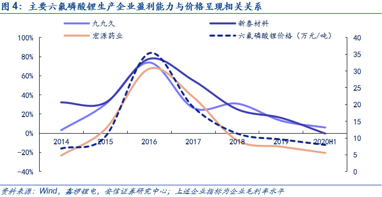 行業(yè)內(nèi)主要企業(yè)盈利能力仍處于周期底部,漲價(jià)訴求強(qiáng)烈。六氟磷酸鋰價(jià)格與行業(yè)內(nèi)企業(yè)盈利能力呈現(xiàn)明顯的正相關(guān)關(guān)系,當(dāng)以行業(yè)主要企業(yè)包括九九久、新泰材料和宏源藥業(yè)等進(jìn)行回溯時(shí),截至2020年上半年,六氟磷酸鋰均價(jià)已接近歷史低位,相應(yīng)地,行業(yè)內(nèi)主要的生產(chǎn)六氟磷酸鋰的企業(yè)盈利能力也處在較低水平,在下半年需求顯著回暖的前提下,預(yù)計(jì)相關(guān)企業(yè)具有漲價(jià)訴求。