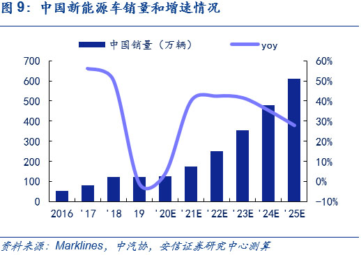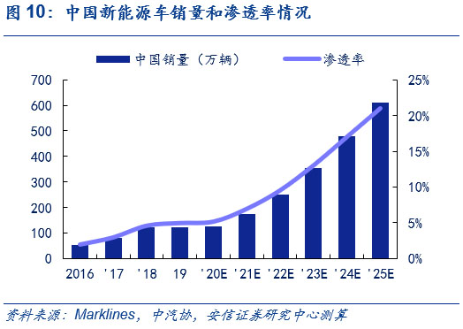 中國(guó)方面,產(chǎn)品驅(qū)動(dòng)推動(dòng)中國(guó)新能源車市場(chǎng),2025年銷售量將超600萬輛,6年CAGR達(dá)31%。目前,中國(guó)市場(chǎng)正從政策驅(qū)動(dòng)逐步轉(zhuǎn)向產(chǎn)品驅(qū)動(dòng),結(jié)合Marklines和中汽協(xié)的相關(guān)預(yù)測(cè),考慮到大眾、奔馳和通用為首的傳統(tǒng)車企平臺(tái)化車型持續(xù)布局、造車新勢(shì)力顛覆傳統(tǒng)的產(chǎn)品驅(qū)動(dòng)力持續(xù)發(fā)酵和特斯拉Model Y等產(chǎn)品在未來的潛在爆款效應(yīng),以2019年為基年,我們預(yù)計(jì)中國(guó)今年全年新能源車銷量約125萬輛;明年銷量近180萬輛,同比增長(zhǎng)超40%;2025年達(dá)611萬輛,6年CAGR達(dá)31%,2025年新能源車滲透率超20%,測(cè)算過程可參見此前外發(fā)周報(bào)《歐洲電車逆勢(shì)增長(zhǎng)超預(yù)期,中國(guó)產(chǎn)品力驅(qū)動(dòng)持續(xù)凸顯》。
