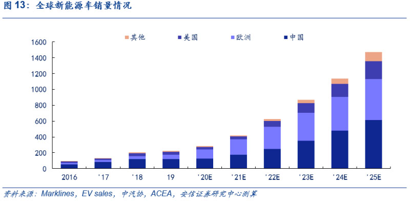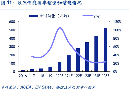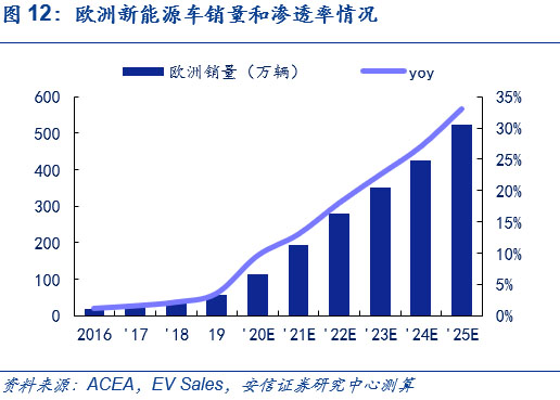 歐洲方面,預(yù)計(jì)歐洲電動(dòng)車高增長(zhǎng)態(tài)勢(shì)將持續(xù),2025年銷售量將超500萬輛,6年CAGR達(dá)45%。目前,在歐洲碳排放法規(guī)的倒逼和高補(bǔ)貼政策的推動(dòng)下,新能源車在今年快速發(fā)展,結(jié)合ACEA和Ev Sales的相關(guān)預(yù)測(cè),考慮到歐洲對(duì)于新能源車的高補(bǔ)貼政策將在近年來延續(xù)、大眾、奔馳為首的傳統(tǒng)車企平臺(tái)化車型持續(xù)布局和特斯拉歐洲工廠的建立,以2019年為基年,我們預(yù)計(jì)歐洲今年全年新能源車銷量近120萬輛;明年銷量將近190萬輛,同比增長(zhǎng)近70%;2025年達(dá)520萬輛,6年CAGR達(dá)45%,2025年新能源摻和滲透率超30%,測(cè)算過程可參見此前外發(fā)周報(bào)《歐洲電車逆勢(shì)增長(zhǎng)超預(yù)期,中國(guó)產(chǎn)品力驅(qū)動(dòng)持續(xù)凸顯》。