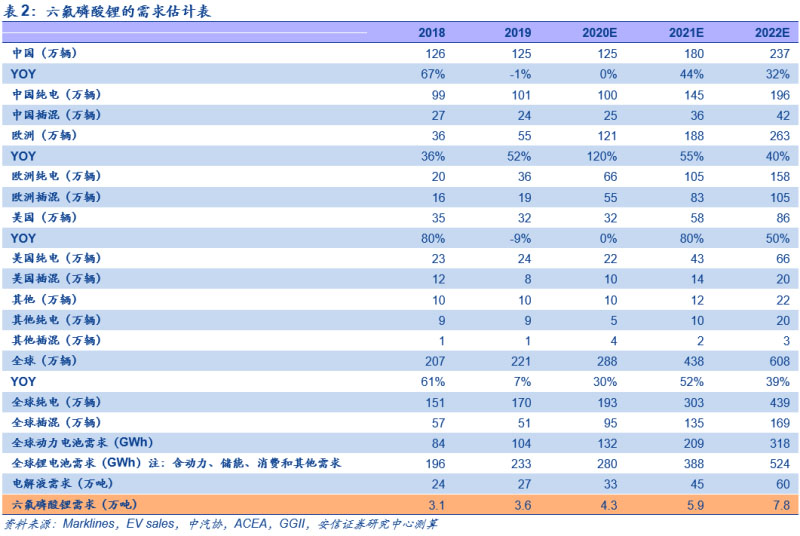 預(yù)計(jì)明后年六氟磷酸鋰需求分別為5.9/7.8萬噸,同比分別增長(zhǎng)38%/33%。根據(jù)我們的測(cè)算,我們預(yù)計(jì)2020年全球新能源汽車銷量合計(jì)280萬輛,其中中國(guó)125萬輛,美國(guó)32萬輛,歐洲121萬輛,對(duì)應(yīng)動(dòng)力電池需求132GWh;疊加儲(chǔ)能、消費(fèi)和其他需求;我們預(yù)計(jì)2020年全球鋰電池需求量合計(jì)280GWh。根據(jù)行業(yè)一噸電解液需要0.13噸六氟磷酸鋰的估計(jì),可得出六氟磷酸鋰的需求量為4.3萬噸。而從中期來看,明后年六氟磷酸鋰需求分別為5.9/7.8萬噸,同比分別增長(zhǎng)38%/33%。