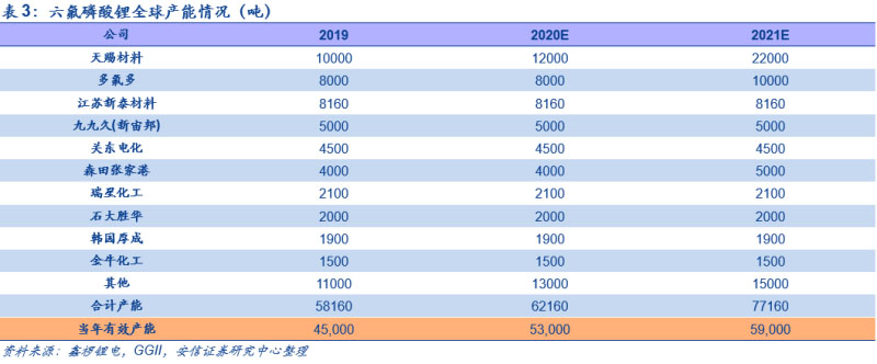 供需缺口疊加成本推動(dòng),漲價(jià)在中期仍具有持續(xù)性:從中長(zhǎng)期來看,需求端,全球新能源車在中國(guó)、歐洲和美國(guó)為首的市場(chǎng)高速發(fā)展,未來五年,在不同國(guó)家多因素驅(qū)動(dòng)的背景下,以2019年為基年,我們預(yù)計(jì)全球2025年新能源車銷量達(dá)1468萬輛,6年CAGR達(dá)37%,2025年新能源車滲透率超15%,在此基礎(chǔ)上,我們測(cè)算明后年六氟磷酸鋰需求分別為5.9/7.8萬噸,同比分別增長(zhǎng)38%/33%。供給端,2020-2022年預(yù)計(jì)形成六氟磷酸鋰名義產(chǎn)能6.3/7.8/9.7萬噸。但由于投產(chǎn)時(shí)間點(diǎn)不同及產(chǎn)能爬坡有一定周期,且原有產(chǎn)能有部分為老產(chǎn)線,有化工檢修等方面的需要,疊加部分小廠在虧損情況下關(guān)停產(chǎn)線,從目前來看,預(yù)計(jì)2020-2022年有效產(chǎn)能分別為5.3/5.9/7.2萬噸,中期新增供給有限,緊平衡格局將持續(xù),相關(guān)六氟磷酸鋰廠商產(chǎn)能利用率將持續(xù)上行。成本端,碳酸鋰、五氯化磷和無水氫氟酸在六氟磷酸鋰的成本中的占比較大,隨著下游需求景氣疊加冬季原料供應(yīng)偏緊,短期內(nèi)碳酸鋰和無水氫氟酸價(jià)格均底部上行。而從中長(zhǎng)期來看,澳洲部分礦產(chǎn)停產(chǎn)疊加南美鹽湖的擴(kuò)產(chǎn)因?yàn)橐咔檠雍蟮确矫娴囊蛩?,鋰礦新增產(chǎn)能釋放高峰期已過將帶來碳酸鋰價(jià)格的持續(xù)上漲,為六氟磷酸鋰的價(jià)格上漲提供支撐。