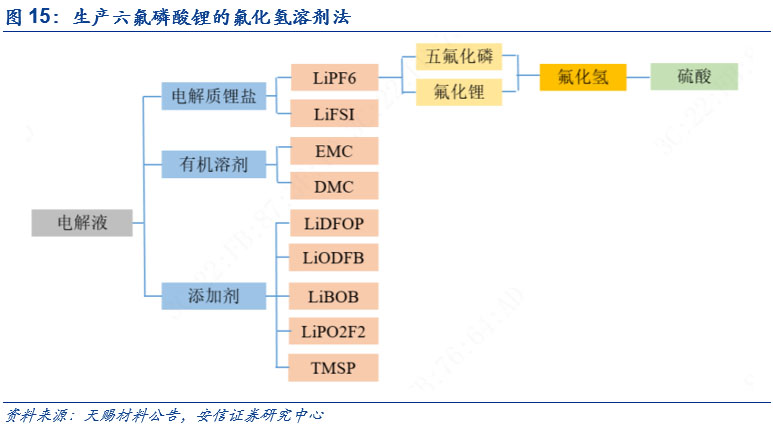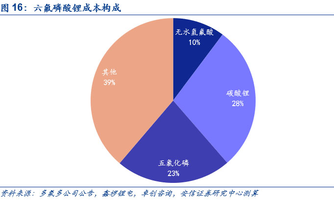 從成本構(gòu)成來看,碳酸鋰、五氯化磷和無水氫氟酸在成本中的占比較大。從六氟磷酸鋰的成本構(gòu)成來看,以多氟多披露數(shù)據(jù)為例來進(jìn)行測(cè)算,目前六氟磷酸鋰的單噸使用量中碳酸鋰、五氯化磷和無水氫氟酸分別為0.3/1.4/0.7噸,結(jié)合鑫欏鋰電,卓創(chuàng)咨詢相關(guān)產(chǎn)品價(jià)格,我們得到碳酸鋰、五氯化磷和無水氫氟酸在六氟磷酸鋰中的成本構(gòu)成分別為28%、23%和10%,占比較高。