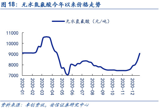 下游需求景氣疊加冬季原料供應(yīng)偏緊,短期內(nèi)碳酸鋰和無水氫氟酸價(jià)格均底部上行。在新能源車下半年景氣度提升的情況下,用于生產(chǎn)新能源車電池電解液鋰鹽六氟磷酸鋰的碳酸鋰和無水氫氟酸的需求持續(xù)增長(zhǎng)(其中碳酸鋰還被用于生產(chǎn)正極磷酸鐵鋰)。而在供給端,由于冬季氣溫驟降,且2020年較往年溫度更低,碳酸鋰上游包括青海在內(nèi)的多個(gè)鹽湖的鋰企下調(diào)產(chǎn)量預(yù)期。與此同時(shí),無水氫氟酸上游螢石粉價(jià)格因冬季的來臨,市場(chǎng)貨源也逐步減少。供不應(yīng)求的局面使得原料成本上漲,在下游需求景氣的情況下,推動(dòng)碳酸鋰和無水氫氟酸價(jià)格底部上行。