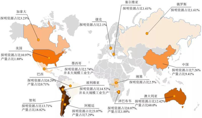 圖2 世界主要鋰資源國家的探明儲(chǔ)量和產(chǎn)量占比