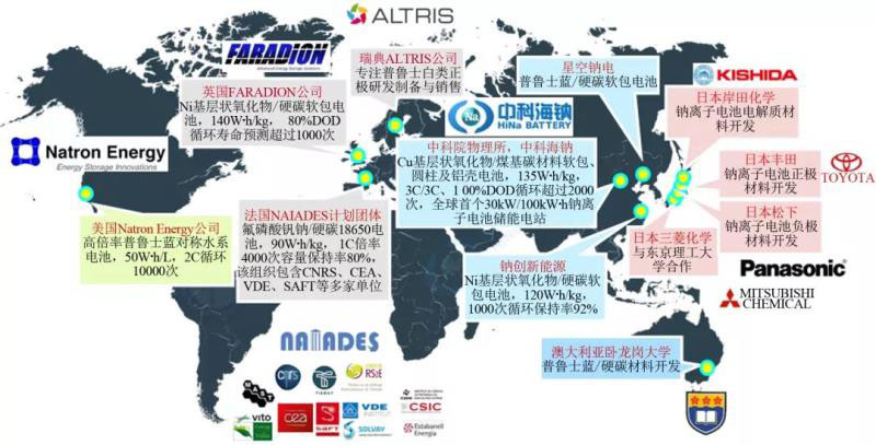 2010年以來,鈉離子電池受到國內(nèi)外學(xué)術(shù)界和產(chǎn)業(yè)界的廣泛關(guān)注。目前,鈉離子電池已逐步開始了從實(shí)驗(yàn)室走向?qū)嵱没瘧?yīng)用的階段,國內(nèi)外已有超過二十家企業(yè)正在進(jìn)行鈉離子電池產(chǎn)業(yè)化的相關(guān)布局,并取得了重要進(jìn)展,主要包括英國FARADION公司、法國NAIADES計(jì)劃團(tuán)體、美國Natron Energy公司、日本岸田化學(xué)、豐田、松下、三菱化學(xué),以及我國的北京中科海鈉科技有限公司、浙江鈉創(chuàng)新能源有限公司、遼寧星空鈉電電池有限公司等(圖4)。不同企業(yè)所采用電化學(xué)體系各有不同,其中正極材料體系主要包括層狀氧化物(如銅鐵錳和鎳鐵錳三元材料)、聚陰離子型化合物(如氟磷酸釩鈉)和普魯士藍(lán)類等,負(fù)極材料體系主要包括軟碳、硬碳以及軟硬復(fù)合無定形碳等。