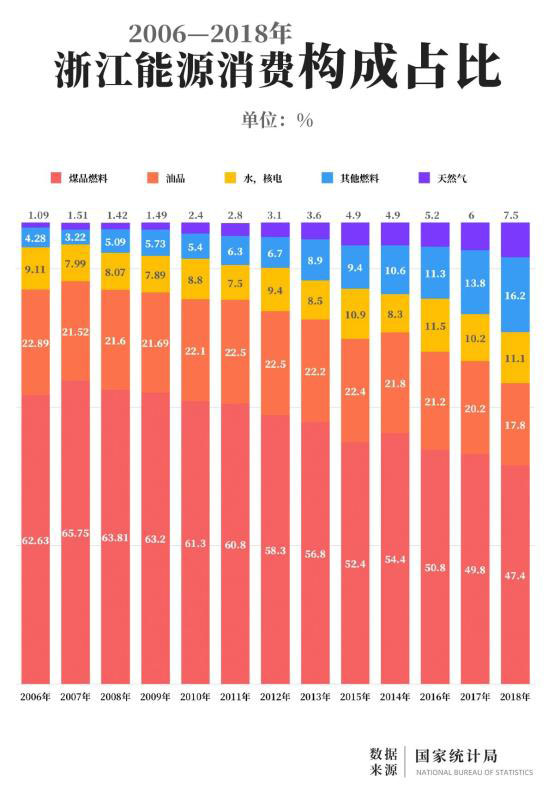 ↑2006—2018年間,浙江能源消費(fèi)構(gòu)成占比變化↑