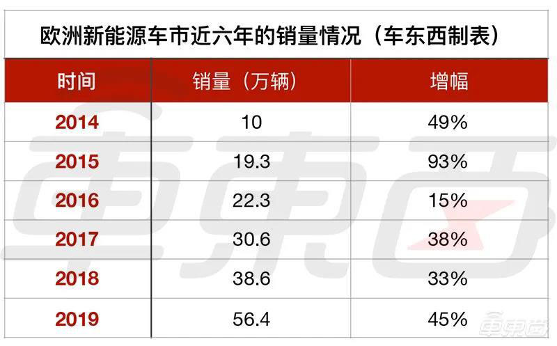 2019年全球各個車企在歐洲共售出了56.4萬輛新能源汽車,這一數(shù)據(jù)已經(jīng)遠遠超過了美國市場的32.5萬輛,成為了全球第二大新能源汽車市場。