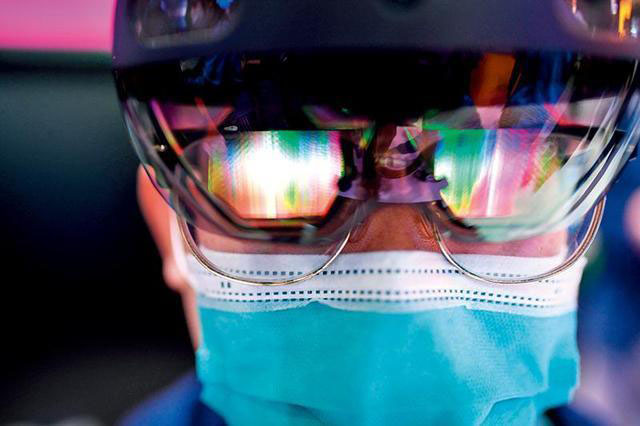 11月6日,一名工作人員在第三屆進博會技術(shù)裝備展區(qū)微軟展臺演示操作 HoloLens2眼鏡 李任滋攝/本刊