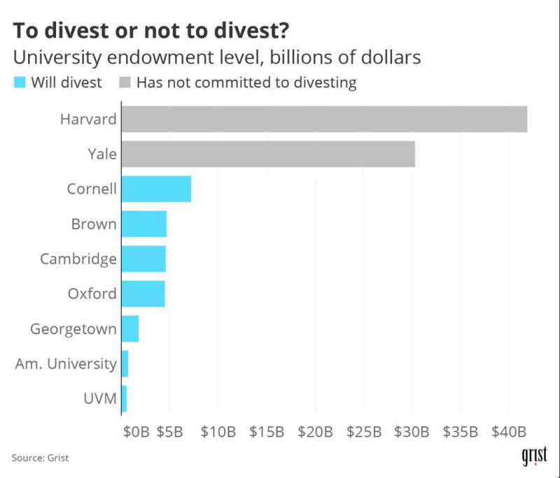 著名的學(xué)校如英國(guó)的牛津、劍橋大學(xué),美國(guó)的喬治敦、布朗、康奈爾大學(xué),加入了越來(lái)越多的大學(xué)和大學(xué)計(jì)劃剝離給他們捐贈(zèng)的化石燃料公司。美國(guó)最富有的兩所大學(xué),哈佛大學(xué)和耶魯大學(xué)的壓力越來(lái)越大,這兩所大學(xué)的捐贈(zèng)總額達(dá)到720億美元。盡管這兩所學(xué)校都沒(méi)有承諾撤資,但哈佛大學(xué)宣布了一項(xiàng)仍然模糊的計(jì)劃,即到2050年將來(lái)自化石燃料公司的捐贈(zèng)額降至零,并聲稱它將能夠與化石燃料公司合作實(shí)現(xiàn)這一目標(biāo)。