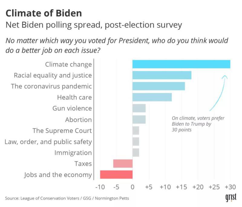 為什么美國(guó)總統(tǒng)候選人要躬身向選民表明他們對(duì)氣候行動(dòng)是認(rèn)真的?因?yàn)槊裾{(diào)顯示氣候變化對(duì)美國(guó)人很重要。大選前,一項(xiàng)全國(guó)性調(diào)查顯示,58%的美國(guó)人對(duì)自己的社區(qū)受到氣候變化的影響“有些擔(dān)心”或“非常擔(dān)心”。環(huán)保選民聯(lián)盟(League of Conservation Voicers)的出口民調(diào)顯示,在有猶疑不決的選民(那些考慮同時(shí)投票給特朗普和拜登的選民)中,拜登在“氣候變化、清潔能源和環(huán)境”問(wèn)題上以58個(gè)百分點(diǎn)的優(yōu)勢(shì)勝于特朗普。