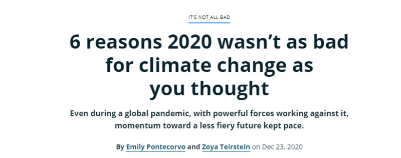 據(jù)Grist.org網(wǎng)站發(fā)表文章,題目是:6 reasons 2020 wasn’t as bad for climate change as you thought (“6個(gè)原因:2020年對(duì)氣候變化的影響不像你想象的那么糟糕”,作者Emily Pontecorvo and Zoya Teirstein)