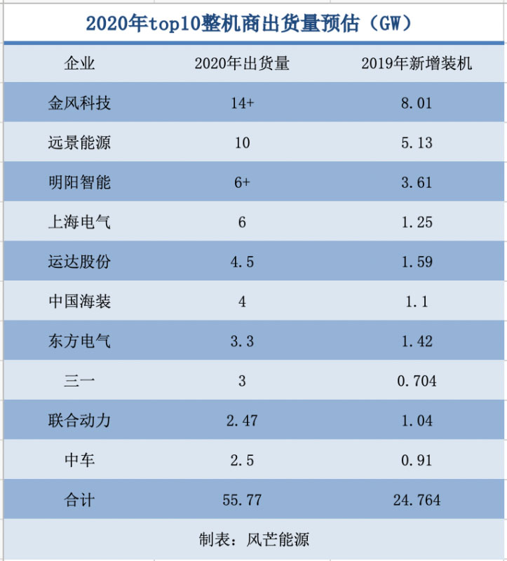 根據(jù)風(fēng)芒能源問(wèn)詢、統(tǒng)計(jì)以及預(yù)估,2020年全年,排名前十的整機(jī)商出貨量將超過(guò)50GW左右。相較于光伏行業(yè)動(dòng)態(tài)變化的集中趨勢(shì),風(fēng)電整機(jī)商的排名及市占率基本保持穩(wěn)定。其中,TOP3的整機(jī)商金風(fēng)科技、遠(yuǎn)景能源、明陽(yáng)智能累計(jì)出貨量超過(guò)30GW,三家市場(chǎng)占比最終預(yù)計(jì)在60%左右,與2019年的62.6%比,雖受搶裝影響,三家市占率稍有減弱,但行業(yè)集中度基本未受影響。