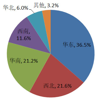 (2)按照區(qū)域分布,排名前五的區(qū)域依次為:華東286.2MW(36.5%)、西北169.5MW(21.6%)、華南166.5MW(21.2%)、西南91MW(11.6%)、華北47MW(6.0%),如下圖所示