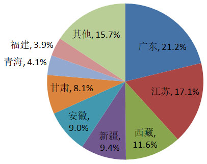 (3)按照省份分布,排名前五的省份依次為:廣東166.3MW(21.2%)、江蘇134.1MW(17.1%)、西藏91MW(11.6%)、新疆74MW(9.4%)、安徽70.6MW(9.0%),如下圖所示。