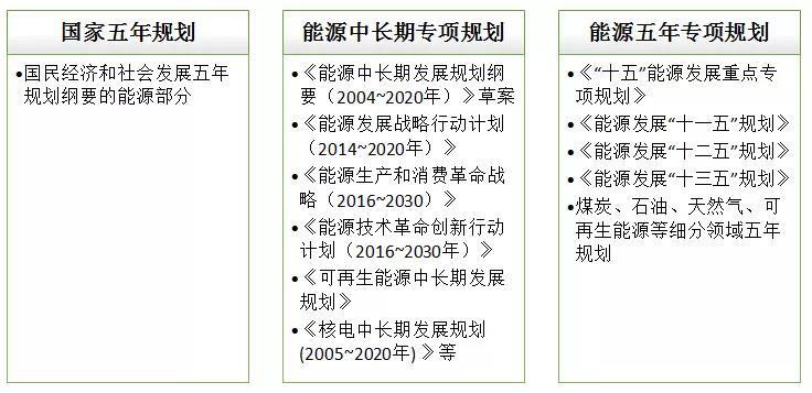國民經(jīng)濟(jì)和社會(huì)發(fā)展五年規(guī)劃綱要中的能源部分,主要闡明國家能源戰(zhàn)略方向,包括五年間的能源發(fā)展總目標(biāo)以及重大建設(shè)項(xiàng)目等,為能源專項(xiàng)規(guī)劃的制定提供了重要遵循。能源中長期專項(xiàng)規(guī)劃一般規(guī)劃較為長期的能源發(fā)展方向,可再生能源、核電等中長期專項(xiàng)規(guī)劃是細(xì)分領(lǐng)域更為長期的發(fā)展戰(zhàn)略,設(shè)定行業(yè)健康發(fā)展的遠(yuǎn)景目標(biāo)。能源五年規(guī)劃根據(jù)國民經(jīng)濟(jì)與社會(huì)發(fā)展五年規(guī)劃綱要制定,是對未來五年內(nèi)能源發(fā)展的規(guī)模與重點(diǎn)項(xiàng)目進(jìn)行設(shè)計(jì)。能源五年規(guī)劃及其細(xì)分領(lǐng)域五年規(guī)劃同一時(shí)間段基本目標(biāo)一致。