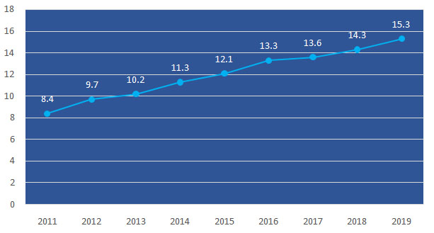 注:2015年[ ]內(nèi)為五年累計值,2019年[ ]為四年累計值。