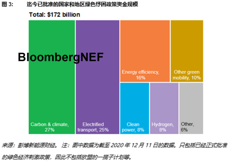 第三,疫情早期 "更好地重建 "(build back better)的呼聲所需的建設(shè)資金逐步落實(shí)。彭博新能源財(cái)經(jīng)"綠色政策追蹤"系列報(bào)告發(fā)現(xiàn),迄今為止,國家和地方政府"綠色"紓困資金撥付規(guī)模達(dá)1720億美元,重點(diǎn)扶持交通電動(dòng)化、清潔化轉(zhuǎn)型;能效提升;清潔電力和氫能等領(lǐng)域。今年的撥款規(guī)模與十年前全球金融危機(jī)后的綠色紓困政策承諾的撥款規(guī)模相近,而當(dāng)時(shí)這部分資金在培育清潔能源產(chǎn)業(yè)和吸引私人投資方面發(fā)揮了重要作用。今年危機(jī)再臨,部分大國推出綠色紓困計(jì)劃。到目前為止,絕大部分資金來自綠色經(jīng)濟(jì)刺激獲批的歐洲國家和韓國,日本也將迎頭趕上;美國和澳大利亞仍無實(shí)際舉動(dòng)。歐盟經(jīng)濟(jì)復(fù)蘇計(jì)劃預(yù)計(jì)近期就能通過,清潔能源領(lǐng)域投資將再添6000億美元。