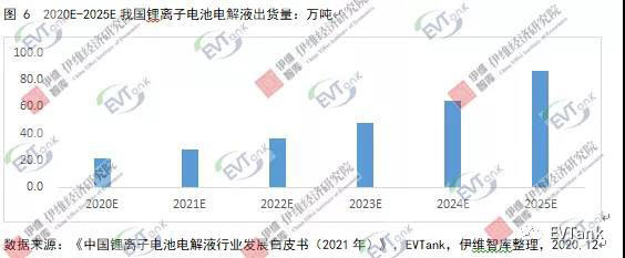 隨著下游新能源汽車動力電池需求增長、新興消費領(lǐng)域快速擴張以及“十四五”期間儲能產(chǎn)業(yè)爆發(fā),鋰電需求旺盛,帶動我國電解液出貨量在未來保持高速增長。預(yù)計到 2025年,我國電解液總體出貨量可達(dá)到 86.5 萬噸,年均增長速度約為31.7%,我國電解液總體市場規(guī)模將達(dá)到 197.8 億元,年均增長速度約為18.6%。