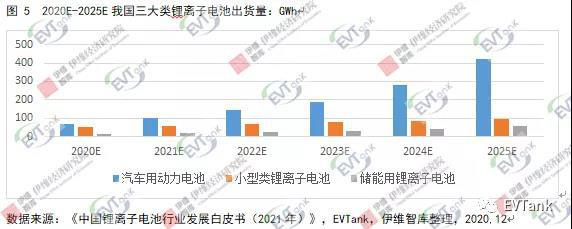 在汽車用動力電池領(lǐng)域,隨著新能源汽車滲透率逐步提升,預(yù)計到2025年,我國動力電池出貨量可達(dá)422.28GWh;在小型類鋰離子電池領(lǐng)域,可穿戴設(shè)備、無人機、小動力等新興消費領(lǐng)域?qū)有⌒皖愪囯x子電池出貨量增長,預(yù)計到2025年,我國小型類鋰離子電池出貨量為96.0GWh;在儲能用鋰離子電池領(lǐng)域,隨著電力體制改革推進(jìn)、儲能成本降低以及鋰電替代鉛酸進(jìn)程加速,預(yù)計到2025年,我國儲能電池出貨量可達(dá)60.0GWh。