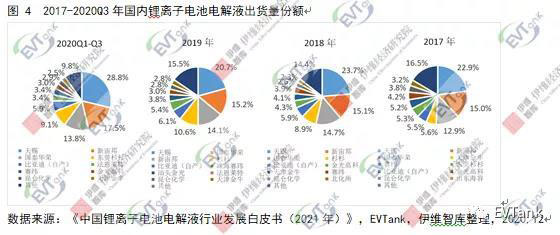 電解液的核心壁壘是保供能力,頭部企業(yè)憑借規(guī)模、成本、研發(fā)能力等優(yōu)勢,市場份額持續(xù)增長,行業(yè)集中度進(jìn)一步提升,2017年-2020Q3前四名企業(yè)合計市占率分別為56.4%、62.4%、60.6%和69.1%。2020Q3前十名企業(yè)合計市占率超過90%,龍頭企業(yè)不同產(chǎn)品分配較均衡,市場格局基本穩(wěn)定,其中天賜材料憑借其產(chǎn)業(yè)鏈布局完善、成本控制能力強、定制化能力突出及客戶壁壘較高等優(yōu)勢,龍頭地位穩(wěn)固;新宙邦、國泰華容、杉杉等第一梯隊企業(yè)增量明顯;比亞迪、法恩萊特、珠海賽緯和金光高科等第二梯隊企業(yè)市場份額也在逐步提升。具體來看,天賜材料穩(wěn)居第一,市場份額達(dá)到 28.8%;新宙邦排名第二,市場份額為 17.5%;國泰華榮排名第三,市場份額為 13.8%;東莞杉杉排名第四,市場份額為9.1%。