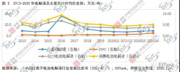 下游需求躍增疊加新增產(chǎn)能不足,電解液產(chǎn)業(yè)鏈整體供需偏緊,帶動電解液及原材料價格上漲。電解液上游原材料主要包括電解質(zhì)、有機溶劑、添加劑等,目前最主要的電解質(zhì)為六氟磷酸鋰,在電解液成本中占比在40%左右,其價格變動對電解液價格的影響較大,自2016年價格達(dá)到歷史高位之后,市場整體延續(xù)供過于求的格局,2020年上半年均價處于歷史低位,2020年下半年受下游需求突發(fā)增長和新增供給有限的影響,Q4均價回升至9.97萬元/噸,同比增長3.85%,環(huán)比增長17.69%;電解液最主要的溶劑為DMC(碳酸二甲酯),在電解液成本中占比約為18%,受環(huán)保等因素影響,2019 年以來其均價走勢總體向上,2020Q4均價為1.52萬元/噸,同比增長134.15%,環(huán)比增長70.8%;電解液均價主要取決于上游原材料價格及行業(yè)競爭格局,在2016年達(dá)到頂峰,隨后呈下降趨勢,2020年Q3開始,電解液價格在原料供應(yīng)緊張和漲價的帶動下也呈現(xiàn)出上漲的趨勢,但是受制于下游動力電池客戶的壓力,其漲價幅度明顯較小,電解液企業(yè)的毛利受到一定的影響。