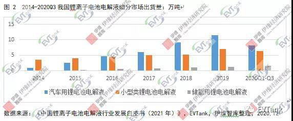 電解液屬于鋰電四大材料之一,是鋰離子電池的血液,在保障鋰離子電池的安全性、長循環(huán)等性能方面至關(guān)重要。目前,電解液已基本實現(xiàn)國產(chǎn)化,其出貨量與鋰離子電池出貨量成正比。2020年初受疫情影響,鋰電池需求低迷、開工率低,隨著二季度國內(nèi)疫情控制后有序復(fù)工復(fù)產(chǎn),國內(nèi)經(jīng)濟復(fù)蘇超預(yù)期,鋰電池需求增長帶動電解液出貨量回升,截止2020Q3,我國鋰離子電池電解液出貨量為16.1萬噸,近六年年均增長速度為34.5%,其中,汽車用動力電池電解液出貨量為8.2萬噸,小型類鋰離子電池電解液出貨量為6.3萬噸,儲能用鋰離子電池電解液出貨量為1.6萬噸。