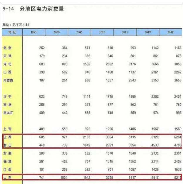 根據(jù)《中國統(tǒng)計年鑒2020》》的數(shù)據(jù),用電量排名前四省份廣東、江蘇、山東、浙江,恰與他們在國內(nèi)的經(jīng)濟地位相一致。
