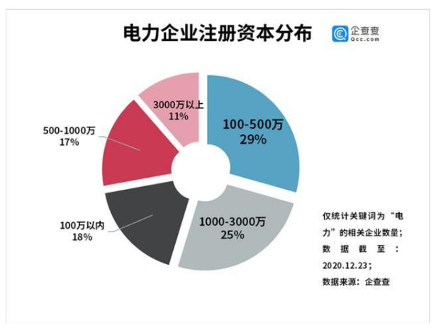 從企業(yè)類型來看,電力企業(yè)中有限責(zé)任公司數(shù)量較多,共125.31萬家,占比約為94%。從注冊資本來看(個體工商戶除外),企查查數(shù)據(jù)顯示,電力相關(guān)企業(yè)的注冊資本分布較為均勻,在100-500萬元的有29%,占比為29%,注冊資本在100萬元以內(nèi)的占24%??傮w來看,注冊資本高于1000萬的企業(yè)占比36%。