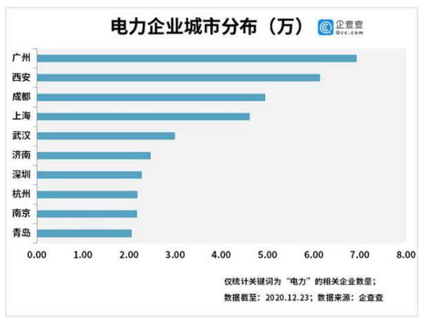 從城市分布來看,企查查數(shù)據(jù)顯示,廣州以6.92萬家電力相關(guān)企業(yè)排在第一,西安和成都作為西部經(jīng)濟發(fā)展重要城市,以6.13萬家和4.94萬家電力企業(yè)排在前三位。上海以4.61萬家企業(yè)位居第四。