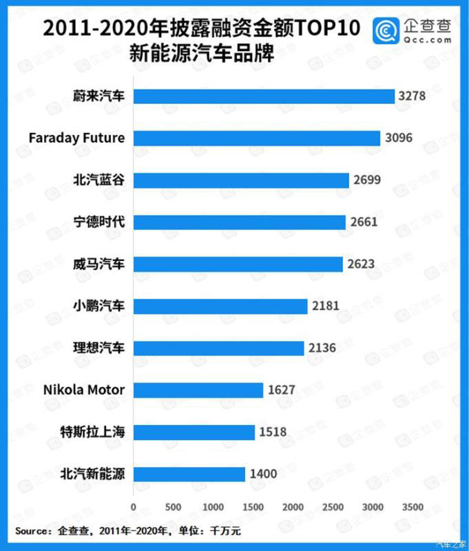 從新能源汽車品牌的融資總金額來看,蔚來汽車以327.8億元摘得魁首,F(xiàn)araday Future(法拉第未來)以309.6億元位居第二,北汽藍(lán)谷以269.9億元位居第三。此外,入圍融資金額TOP10的新能源汽車相關(guān)品牌還有寧德時(shí)代、威馬汽車、小鵬汽車、理想汽車等。