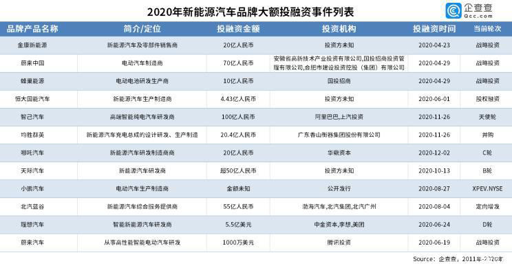 2020年,在傳統(tǒng)車市遇冷的大背景下,新能源汽車?yán)^續(xù)保持增長的態(tài)勢。依照最新數(shù)據(jù)顯示,2020年1-11月,全國乘用車市場累計(jì)零售量同比下降8.3%,但同時(shí)期的新能源汽車銷量卻同比增長了3.9%。從融資事件數(shù)和披露的金額來看,2020年新能源汽車品牌融資事件數(shù)比去年下降了18.3%,但披露的融資金額同比大漲159.4%,達(dá)到1292.1億元,近十年來首次突破千億。