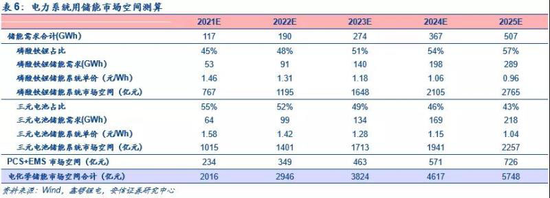 1)根據(jù)2.1測算,2021-2025年電力系統(tǒng)用儲能裝機(jī)需求分別為117、190、274、367和507GWh,需求年平均增速約為83.34%。磷酸鐵鋰鋰電池占比預(yù)計將從2021年的45%提升至2025年的57%;